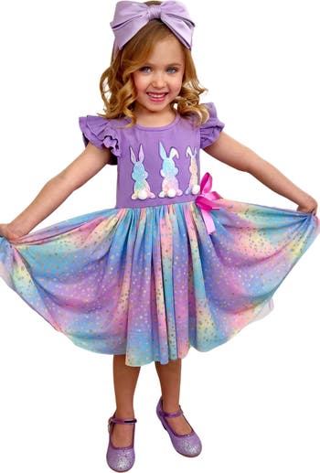 - Dress features scalloped flutter sleeves, a gradient rainbow polka dot bunny silhouette embroidered bodice with cotton tail applique, small ribbon bow at the waist, and gradient rainbow polka dot mesh tulle skirt with full lining and elastic waistband