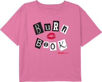 - Strut your stuff with this stylish new girls' crop t-shirt that is perfect for every occasion! Featuring the words: "Burn Book," in cut-out letters and a kiss mark across the front.