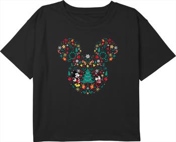 - Strut your stuff with this stylish new Christmas girls' cropped t-shirt that is perfect for this holiday season! Featuring a super cute graphic of the Mickey Mouse silhouette logo filled with a Christmas-themed pattern.