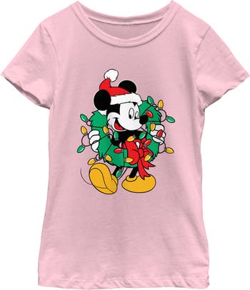 - Strut your stuff with this stylish new Christmas girls' tee that is perfect for the holidays! Featuring the adorable Mickey Mouse holding a Christmas wreath that is decorated in colorful bulbs.