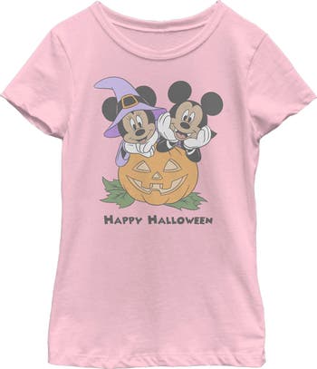 Who knew that dressing "mousey" could be so cute!? Celebrate Walt Disney's most iconic character with this officially licensed Mickey Mouse and Friends style! This distressed, retro Girls' Tee portrays Mickey and Minnie in adorable Halloween costumes while leaning on a jack-o-lantern. The perfect tee for your next Halloween celebration!