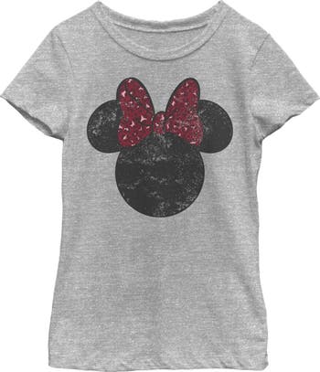 - Strut your stuff with this stylish new every day girls' t-shirt that is perfect for every occasion! Featuring a super cute distressed graphic of Minnie Mouse's logo with a red leopard print bow across the front.