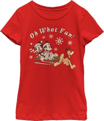 - Strut your stuff with this stylish new Christmas Girls' T-Shirt that is perfect for the holidays! Featuring retro Mickey and Minnie in a snow sled led by Pluto along with the phrase: "Oh what fun," above them.