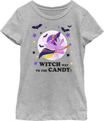 - Strut your stuff with this stylish new Girls' Tee that is perfect for every occasion! Featuring Twilight Sparkle dressed as a witch and riding a broomstick with the text "Witch Way to the Candy?" on the front.