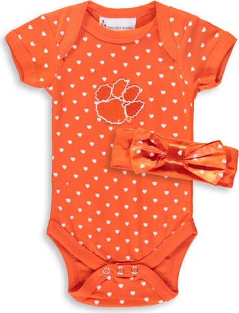 Let your little one cheer on the Clemson Tigers in this inspiring Hearts bodysuit and headband set.