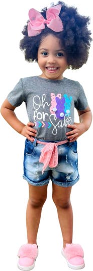 Oh for Bunnie's sake, let go on an Easter hunt and find all those eggs wearing this adorable graphic tee and denim shorts set. Now your cutie can have her own special pair of acid-washed fringed denim topped with a lace bow belt. The stylish bunny graphic on the grey top will make this an instant Spring favorite.