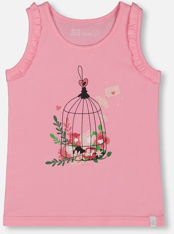 Little ruffles lend ultra-girly style to our Organic Cotton Tank with Frills Candy Pink. Soft and stretchy in cotton/elastane, this versatile tank top features wide straps with ruffle trim, a scoop neckline, and an adorable flower and birdcage graphic on the chest.