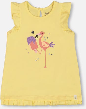 Girl's Organic Cotton Tunic With Frill And Print Yellow And Flamingo