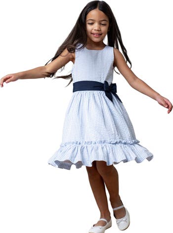 Our playful party dress in soft organic cotton seersucker has all the incredible details that make it perfect for everything from dinner with the family to twirling on a dance floor. Features a contrast waist sash with bow, flouncy ruffle at the hem, flattering cross back straps, and a side zipper for easy dressing. Ready for all her special occasions.