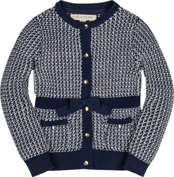 Our sophisticated sweater cardigan in soft organic cotton is elevated by a beautiful tweed-like stitch. Features gold buttons, front patch pockets, contrast trim, and a sweet bow detail at the waist. This piece pairs perfectly with our collection of organic cotton knit tops and skirts for a polished look.