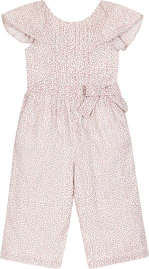 Cute, charming and easy to wear, our pintuck jumpsuit is the perfect addition to any girl's springtime wardrobe. Features a flouncy flutter collar and sleeve, sweet bow detail at the waist, delicate pintucking at the center, and stretchy smocking at the center back for a comfortable fit. Lined in soft organic cotton.