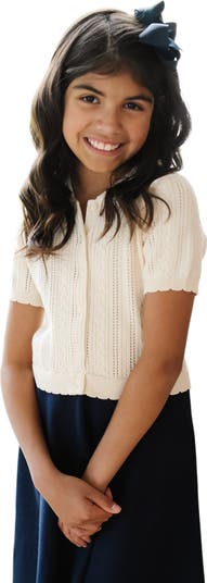 Your girl will be the epitome of chic in our soft organic cotton blocked sweater dress. This special piece features a pointed sweater knit collar, textured fancy stitch bodice with scallop edge trim, a full colorblocked skirt, and a front button closure. An absolutely darling look she'll want to wear time and time again.