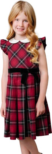 Cut from soft and chic organic cotton calvary twill in a classic silhouette, this pretty dress will be your girl's go-to piece for picture time this holiday season. Features a woven peter pan collar, sweet flutter sleeves, and velvet trim at the waist sash and bow. Fully lined with a zipper closure down the center back for easy dressing.