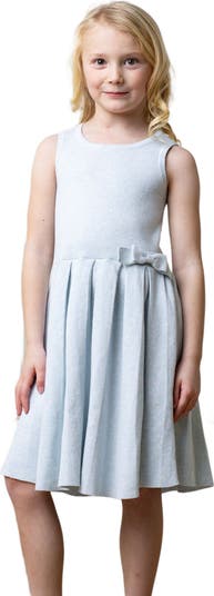 Our sleeveless pleated sweater dress in soft organic cotton is a sophisticated take on springtime dressing. Features an easy and comfortable silhouette with a decorative bow at the waist and a pleated skirt that she will love to twirl in. Can be dressed up easily with one of our beautiful organic cotton cardigans.