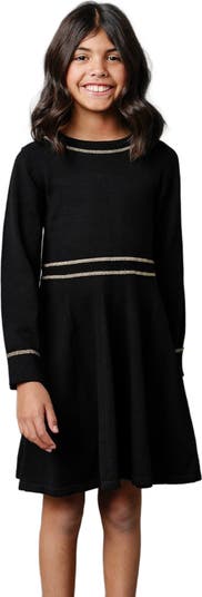 Our sophisticated sweater dress has a little something extra (in this case, a gold tipped ruffle collar) for a holiday look that is special. Crafted from soft organic cotton, this beautiful dress features gold tipping at the collar, cuffs, and waist, and has gold buttons at the back neck for easy dressing.
