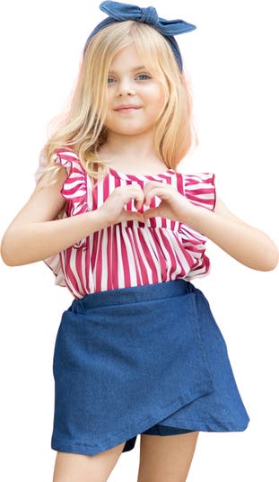 Dress up your little firework in this sassy flutter sleeve striped top and wrap skort set! Featuring bold red stripes paired with dark navy, this is the perfect mix of sophistication and fun to celebrate the 4th of July.