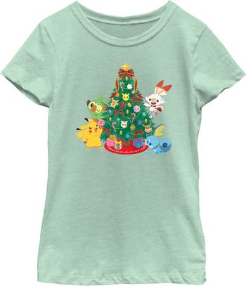 - Strut your stuff with this stylish new Christmas girls' t-shirt that is perfect for the holidays! Featuring a graphic of Pikachu, Grookey, Scorbunny, and Sobble around an adorned Christmas tree with gifts.