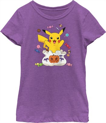 - Strut your stuff with this stylish new Halloween Girls' T-Shirt! Featuring Pikachu with a bag full of Halloween candy!