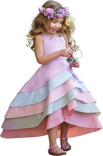 - Sleeveless racerback hi-lo maxi dress with multicolor pastel tiered skirt