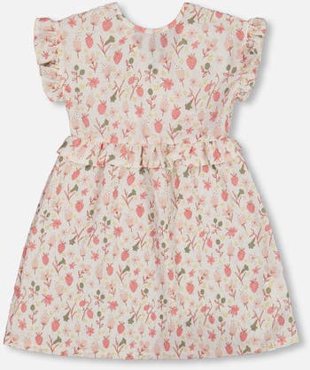 Deux par Deux Girl's Printed Seersucker Dress With Frill Pink Flowers On Cream Background, Main, color, Pink Flowers On Cream