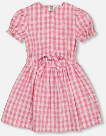 She'll look oh-so-adorable in our Puff Sleeve Dress with Waist Tie Pink and White Checks. With a bold gingham pattern and floral print, this casual dress features short puff sleeves, a round neckline, and a button front bodice with a cutout waist and a tie knot at the hem. A flared A-line skirt with a stretchy elastic waistband makes it super comfortable to wear!