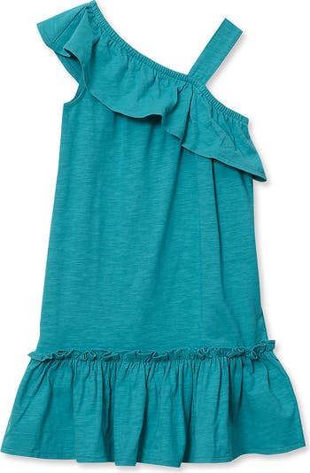 Asymmetrical ruffles for twirl-worthy fun. Sweet style blooms in our 100% cotton sleeveless dress. The playful asymmetrical design features a single strap and delightful ruffle details. A tiered hem adds twirl-worthy movement perfect for summer adventures or special occasions. Lightweight comfort meets adorable flair.
