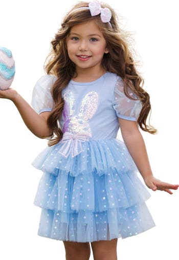 Your little one will dazzle in this enchanting bunny-themed dress, perfect for Easter celebrations and beyond! Adorned with shimmering sequin bunny ears and a statement bow at the waist.