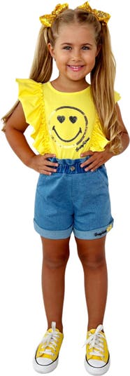 Fuel her confidence with fashion that stands out, like our brilliant and bold SmileyWorld® denim shorts set. A fabulously fun sequin Smiley icon flutter sleeve top and matching embroidered denim shorts are sure to catch every day and create happy expressions.