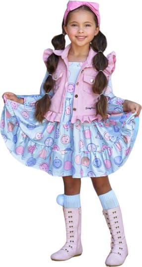 Your little girl will be radiating in our denim vest and ornament dress set. This fun pairing features a beautiful mix of light blue and pink, Smiley icon ornaments, and ruffle details to show off her bright personality. This sweet stand-out looks great, no matter the occasion.