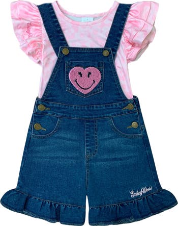 Confidence starts with the right outfit. Get your little girl our amazing SmileyWorld® overall short set. Deep blue denim, girly ruffles, and a charming pink print top. It's fashion that speaks her language.