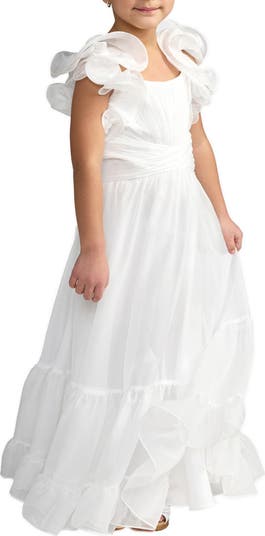 Girls Solid Chiffon Maxi Dress with Ruffle Sleeves and Flowing Skirt. Features an elegant silhouette with soft draping, perfect for weddings, parties, and special occasions.