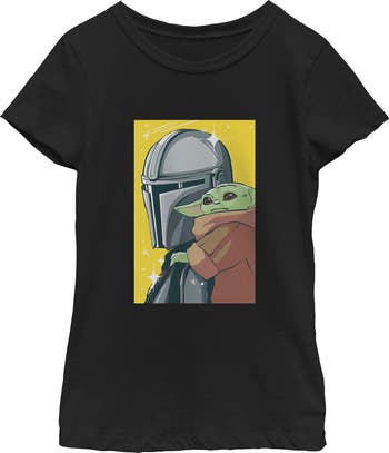 - Protect the galaxy with this girls' t-shirt that will look perfect alongside the New Republic! Featuring a cute graphic of Grogu holding onto Din Djarin's shoulder on the front.