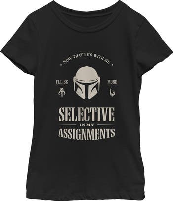 - Protect the galaxy with this girls' t-shirt that will look perfect alongside the New Republic! Featuring The Mandalorian's helmet and the text "No That He's With Me, I'll Be More Selective In My Assignments" printed across the front.