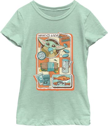- Protect the galaxy with this girls' t-shirt that will look perfect alongside the New Republic! Featuring a colorful collage of Grogu surrounded by food as he snacks on a small meal printed on the front.