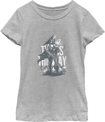 - Experience the thrill of the galaxy with this stylish new girls' t-shirt! Featuring The Mandalorian standing tall, with Grogu nestled beside him, and the legendary "This Is the Way" quote, all portrayed in an artistic sketch style.