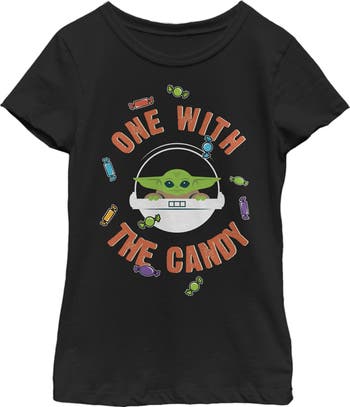 - Strut your stuff with this stylish new Halloween girls' t-shirt that is perfect for trick or treating! Featuring the adorable Grogu inside his bassinet with the phrase: "One With the Candy," encircling him.