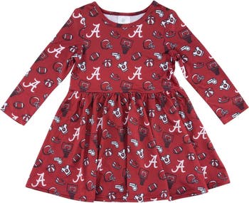 Dress your little one in head-to-toe Alabama Crimson Tide pride with this adorable ZooZatz Allover Print Long Sleeve Dress. This adorable dress features a repeating pattern of team logos and sports icons, making it perfect for showcasing your little one's Crimson Tide pride. The flowy design, crafted from a blend of polyester and spandex, allows for comfortable movement, ensuring your toddler can twirl and cheer with ease.