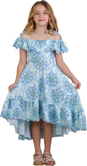 Let her shine in our Blooming Blue Hi-Lo Ruffle Dress, a perfect blend of elegance and charm for any sunny occasion.Featuring a captivating floral print in shades of blue, this dress showcases a statement ruffled neckline with tie straps for a customizable fit. The tiered, flowy skirt adds playful movement, making it ideal for twirling at family gatherings, beach photoshoots, or garden parties.