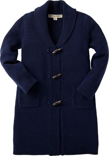 This long sweater cardigan in our plush organic cotton will keep her warm and cozy on chilly fall nights. Features a classic shawl collar, cozy tunic length silhouette, front patch pockets, and faux horn toggle closures at the front. Layers perfectly over our collection of organic cotton dresses, tops, and leggings.