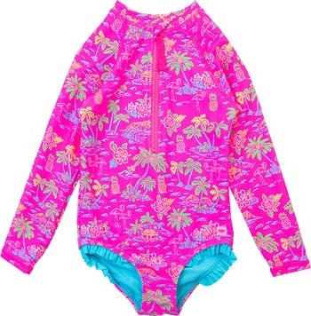 RuffleButts Girls UPF50+ Sun Protection Long Sleeve Rash Guard One Piece, Main, color, Neon Island Time