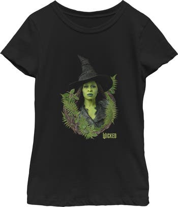 - Real style and friendship are truly unlimited with this new girls' t-shirt that is perfect for whenever you're feeling a little defiant! Featuring the powerful Elphaba surrounded by mystical branches and leaves, along with the iconic Wicked logo in matching green style.