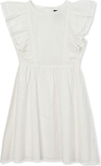 Just in time for spring, this lightweight woven dress is crafted with eyelet fabric and sweet little ruffle details on the sleeves and chest. Style with sneakers and a denim jacket for a cute warm-weather look.
