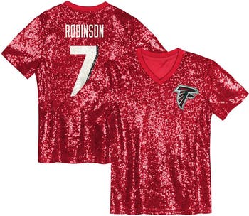 Young Atlanta Falcons fans can shimmer and shine on game day in this Bijan Robinson Sequin V-Neck Fashion Jersey. It's decked out in dazzling team-color sequins all over and displays their favorite player's name and number in sequins on the back for extra sparkle. Lightweight, breathable polyester mesh fabric keeps them cool and comfortable while cheering on Bijan Robinson and the Atlanta Falcons.