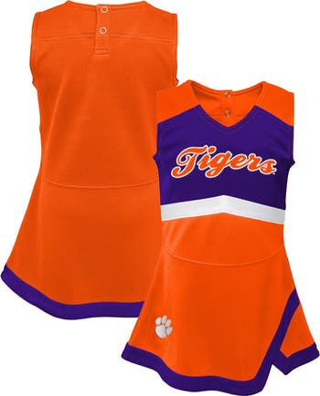 Get your young Clemson Tigers fan ready to cheer on their team with this Cheer Captain Jumper Dress. This spirited jumper dress, crafted from breathable polyester, boasts sewn-on stripes and a charming V-neck, capturing the essence of classic cheerleading style. Embroidered Clemson Tigers appliqus proudly display your young fan's unwavering team loyalty, making this dress perfect for game days.