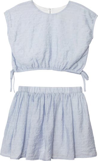 - Add a splash of color to her wardrobe with the Girlypop Blue Two-Piece Set. This light and airy two-piece set features a cap-sleeve top with playful side ties and a matching skirt.Fabric Care & Content Machine Wash Cold