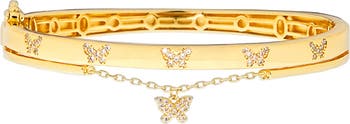 Inset butterflies and a hanging pendant gives a floaty glint to this golden bangle that makes everyday ensembles more whimsical.