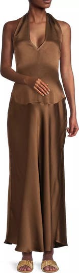 Exude effortless elegance with this stunning satin halter-neck dress. Designed to skim the body with a sleek and sophisticated silhouette, this piece highlights the neckline with its chic halter design and subtle V-neck cut. The flowing midi-length skirt adds a touch of movement and grace, making it perfect for special occasions, evening events, or formal gatherings. Crafted from luxurious fabric with a silky finish, this dress is a timeless addition to any wardrobe.