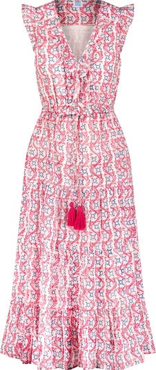 This elegant maxi dress transitions seamlessly from day to night, showcasing a ruffled V-neckline, a cinched elastic waist, and delicate flutter sleeves. Crafted from 100% cotton, it measures 48" in length for a graceful silhouette.