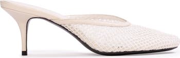 - Angled round toe mesh mule, set on a curved mid heel.