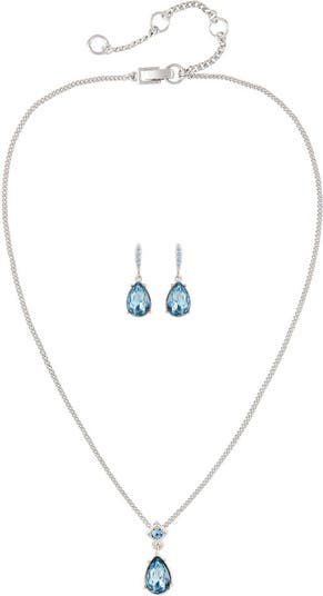 Timeless chic. Rhodium plated Edwardian Revival matching set. Beautiful clip-on earrings featuring sapphire coloured pear shaped Swarovski crystal drops with matching necklace. Necklace closes with an adjustable fold-over clasp, Signed Givenchy